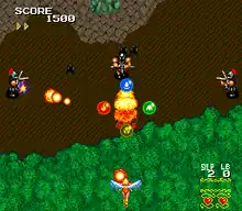 The game is a vertical-scrolling where players control a flying woman (rather than a space ship which is typical of games from this genre).[1] Its gameplay is similar to previous shooters by Compile;[4] The player controls Silphia through eight stages over a constantly scrolling background, populated with an assortment of enemy forces and obstacles, and the scenery never stops moving until a boss is reached, which must be fought to progress further.[1][2][3] Stages have a mid-boss, and then an end boss at each stage.[2]