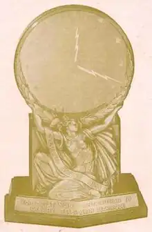 The award winners received a trophy in the form of a clock. A walnut wood base is decorated by a high-relief sculpture of a woman in a robe who carries the clock face on her shoulders. The face is made of glass, with etched gilt stars at each hour and stylized metal lightning bolts for hands. Some versions of the award were functioning electric clocks made by Jefferson Electric Company of Bellwood, Illinois.[1] In others the clock hands were permanently attached to the glass face. The clock was about 14 inches (360 mm) tall, made by the Medallic Art Co. of New York, NY.[10]