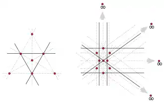 The question of the existence of an ordinary line can also be posed for points in the real projective plane RP2 instead of the Euclidean plane. The projective plane can be formed from the Euclidean plane by adding extra points "at infinity" where lines that are parallel in the Euclidean plane intersect each other, and by adding a single line "at infinity" containing all the added points. However, the additional points of the projective plane cannot help create non-Euclidean finite point sets with no ordinary line, as any finite point set in the projective plane can be transformed into a Euclidean point set with the same combinatorial pattern of point-line incidences. Therefore, any pattern of finitely many intersecting points and lines that exists in one of these two types of plane also exists in the other. Nevertheless, the projective viewpoint allows certain configurations to be described more easily. In particular, it allows the use of projective duality, in which the roles of points and lines in statements of projective geometry can be exchanged for each other. Under projective duality, the existence of an ordinary line for a set of non-collinear points in RP2 is equivalent to the existence of an ordinary point in a nontrivial arrangement of finitely many lines. An arrangement is said to be trivial when all its lines pass through a common point, and nontrivial otherwise; an ordinary point is a point that belongs to exactly two lines.[2]