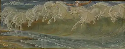 A multifaceted artist, Maurice Denis is considered by some to be the most talented symbolist artist. In addition to being a painter, he was an illustrator, lithographer and set designer, and was also an art critic.[100] Influenced by Ingres and Puvis de Chavannes, as well as Gauguin, Bernard and the Pont-Aven group, and with certain reminiscences of Blake and Pre-Raphaelite painting, developed a work of marked sentimentalism that denotes a conception of naturalistic and pious life, almost naive in its approach of blissful purity, which highlights the decorative, fine color contrasts and harmony of pure lines, with a serene and monumental air. In addition to his pictorial production he illustrated books such as Reply of the shepherdess to the shepherd by Édouard Dujardin, Sanity by Paul Verlaine, Imitation of Christ by Thomas à Kempis or Journey of Urien by André Gide.[101] He later focused on religious art and mural painting, and founded the Studio of Sacred Art.[91]