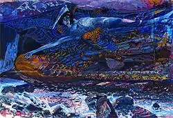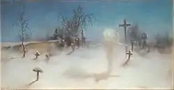 Finally, it is worth mentioning an artist outside the Symbolist movement but whose style has a certain link with it: Henri Rousseau, maximum representative of the so-called Naïve Art, a term applied to a series of self-taught painters who developed a spontaneous style, alien to the technical and aesthetic principles of traditional painting, sometimes branded as childish or primitive. Rousseau, a customs officer by trade, developed a personal work, with a poetic tone and a taste for the exotic, in which he lost interest in perspective and resorted to unreal-looking lighting, without shadows or perceptible light sources, a type of imagery that influenced artists such as Picasso or Kandinski and movements such as metaphysical painting and surrealism.[83] Rousseau's work was highly valued by Symbolist artists such as Redon and Gauguin, especially for its coloring, which they noted transcended a "mythical essence". One of Rousseau's works closest to Symbolism was War (1894, Musée d'Orsay, Paris).[84]