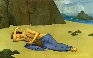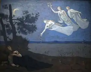 Alphonse Osbert studied at the École nationale supérieure des beaux-arts in Paris, where he was a disciple of Henri Lehmann, Léon Bonnat and Fernand Cormon. His first stylistic reference was the Spanish Baroque, especially José de Ribera.[66] He was also influenced by Georges Seurat and Pierre Puvis de Chavannes. Through his friend the critic Henry Degron he entered the circle of Maurice Denis and the Nabis, and assiduously attended the salons of the Rosicrucians. Osbert's production focused on a type of bucolic and dreamlike landscapes of ethereal tones, with a preference for blue and mauve, populated by female figures in motionless, contemplative attitude.[67] On most occasions these figures allude to the Muses, dressed in vaporous veils and framed in idyllic landscapes, generally with a twilight setting.[66]