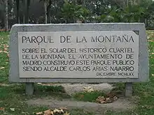 The building, which had been mostly destroyed during the siege, suffered the impact of numerous artillery attacks during the war because of its proximity to the frontlines, which were more or less unchanged since early 1937. Towards the end of the war the building was reduced to ruins, which could still be seen in the early Sixties. A park, the Parque del Cuartel de la Montaña, was inaugurated on 20 July 1972, when Franco was still in power and Carlos Arias Navarro, the future prime minister, was mayor of Madrid. It incorporates a monument by Joaquín Vaquero Turcios, also from 1972, in memory of those who died in its defence. This monument consists of a bronze figure representing the body of an injured man at the centre of a wall sculpted in the form of sandbags.