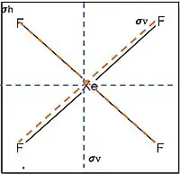 Mirror planes are denoted by σ. In a molecule that also has an axis of symmetry, a mirror plane that includes the axis is called a vertical mirror plane and is labeled σv , while one perpendicular to the axis is called a horizontal mirror plane and is labeled σh . A vertical mirror plane that bisects the angle between two C2 axes is called a dihedral mirror plane, σd .[6]