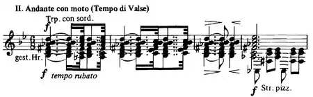 The work is fully representative of the composer's later style with its curious, shifting harmonies, the almost Prokofiev-like grotesquerie of the outer movements and the focus on individual instrumental tone colors throughout (highlighted by his use of an alto saxophone in the opening dance).[2] The opening three-note motif, introduced quietly but soon reinforced by heavily staccato chords and responsible for much of the movement's rhythmic vitality, is reminiscent of the Queen of Shemakha's theme in Rimsky-Korsakov's opera The Golden Cockerel,[5] the only music by another composer that he had taken out of Russia with him in 1917.