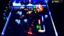The core game is otherwise like most arcade shoot-em-ups like Galaga, where the player must maneuver their ship across the bottom of the screen to evade enemy ships and fire, while firing on the enemies to destroy them and "protect" their music.[1] Points are scored for defeating enemies and the player can earn a scoring multiplier by keeping a chain of destruction going. If the ship is hit, parts of it will fall off, but the player can collect notes left behind by destroyed ships to restore the ship. Should the ship take too much damage, the ship will respawn after a few moments, but the player's score will be penalized. The player is also penalized for allowing certain ships from remaining on screen for too long, affecting their music. Certain target scores are pre-determined for each song, with the player's goal to surpass these levels. When the song is completed, they then gain in-game currency and the opportunity to buy a new weapon for their ship.