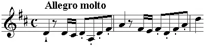 The figure, which appears in various keys throughout the movement, is treated in a manner which hints at fugue. Near the end it is heard in the strings in stretto (overlapping entries, a new one beginning before the last has ended).
