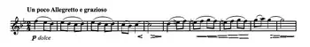 The Allegretto is in the key of A♭ major and begins with a calm, stepwise melody in the clarinet. The four-bar figure is extended to an irregular five bars through a small bridge between the phrases by the strings. The clarinet rounds off the A theme in the Allegretto with an inversion of the first five bars heard.