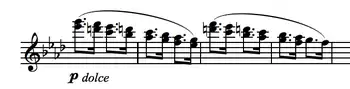 A distinctive 'turning' motif, derived from the main theme, appears in the winds, traded between flute and oboe with lush string harmony accompaniment. This is followed by an energetic passage, mainly in the strings, featuring falling arpeggio figures and elements of the main theme recited in C minor/F minor.[3]