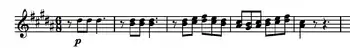 8 time. As the responsibility for the main theme shifts from the violins to the woodwinds, the strings and timpani begin to sound out a da-da-da-DUM rhythm which is strongly reminiscent of the "fate" rhythm of Beethoven's Fifth Symphony.[3]