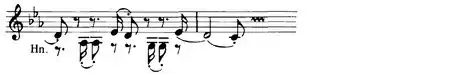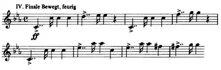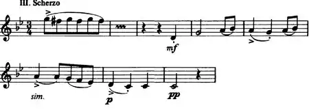 The originally conceived Scherzo was not fully orchestrated either, lacking trumpets and trombones, but its Trio was carried over unchanged in 1866.[2] The scherzo of this draft version exhibits many irregular phrase rhythms which Bruckner evened out in later versions.[3] This early Scherzo (manuscript Mus.Hs.6019) is very short and quite distant in character from what Bruckner eventually used in the Linz version.[4] In the leaflet for his recording of the symphony, Tintner writes that "the earlier very short Scherzo, which Bruckner discarded before 1866 (because of its brevity?), with chromatic syncopation, is perhaps more interesting [than the final one]."