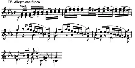 4, compound ternary form, with a trio initially in A♭ major. Compared to the standard minuet & trio form, there is an additional transition to the main minuet after the binary form trio section.) - Allegro con fuoco (C minor, 4