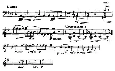 For the concertante's first movement, the slow introduction developing the main motif is shortened from the symphony with the material not discarded but instead shifted to the concertante's cadenza immediately after the climax. The concertante's second movement largely following the symphony's third movement, except for immediately after the climax when the exposition of the symphony's second movement is inserted, before returning to the symphony's third movement recapitulation.