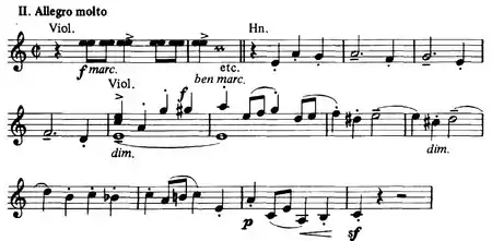 This movement really only resembles a scherzo insofar as it relates to the early- to mid-Romantic tradition of symphonic movements, and its use of a typical scherzo form (ABACABA). However, it is in 2/2, while the typical scherzo would be in 3/4 or some kind of triple meter. The movement, in A minor, opens with a lively ostinato in the upper strings. As a fixture in large-scale works by Rachmaninoff, the Dies Irae plainchant is referenced, here in the opening bars by the horns.