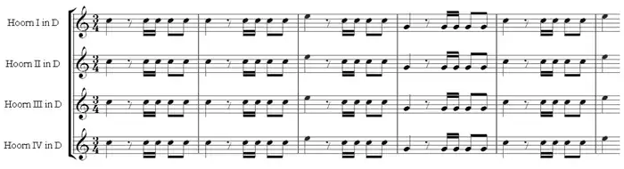 It is the first movement that shows off the horn section most dramatically, although not with the hunting calls he would later be known for in The Seasons or his Symphony No. 73, La chasse.[11] Here, Haydn begins with a military fanfare including all four horns:[12]