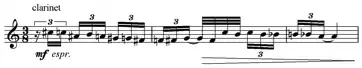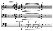 Two additional motives occur during the build-up to the climax. The first is found mainly in the upper winds and strings and is made up of faster moving ascending and descending chromatic scale fragments. The second occurs in the low winds and brass and primarily uses the dissonant intervals of a tritone and a minor ninth. This opening movement is thematically important in that it introduces both the chromatic scale and the tritone as the primary melodic building blocks for the entire symphony. Scholar Tadeusz Zielinski also notes that Penderecki's use of the chromatic scale is similar to Béla Bartók's treatment in works such as Music for Strings, Percussion, and Celesta, and Sonata for Two Pianos and Percussion.[21]