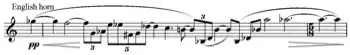 After the climax, the ostinato of the Passacaglia returns to D and the movement experiences a dénouement. It ends with a gradual recession of momentum and a brief recall of the lyricism of the previous Adagio. Here, solo winds take brief melodies over a now fragmented ostinato, as seen in the English horn solo at mm. 101–103 (Example 14). The movement closes with a repeated figure in the bass, seen fragmented in mm. 101–105, with celli in imitation (Example 15).