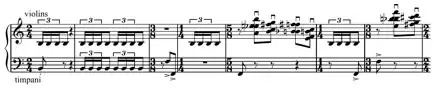 The symphony's conclusion is striking in its use of a clearly stated major key sonority, a marked difference from the chromatic saturation of the entire symphony. This ending, however, features a final reinforcement of the tritone, with a B major chord in the full brass supported by a strong F in the timpani (Example 19). The final measures then emphasize a unison F in the entire orchestra, a final recall of the repeated F which opened the symphony.