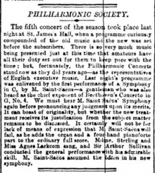 Saint-Saëns' decision to compose an actual symphony in response to the Philharmonic Society's request was unusual. First, almost thirty years had passed since the forty-nine year old composer had last written a symphony (in 1859), and his reputation as a concert composer derived principally from his piano concertos and symphonic poems. Second, the Society's interest in an orchestral or symphonic work by a French composer would have generally precluded an actual symphony since, as a genre, it had been largely ignored by French composers.[11] While symphonies were regularly performed in Parisian concert halls, appearing in more than half of the "Grands concerts" series that were comprised by the orchestral societies of Jules Pasdeloup, Édouard Colonne, and Charles Lamoureux, almost all were by Austro-German and Nordic composers, especially those of Beethoven, Mendelssohn, and Schumann.[12][13] French symphonic composers of the late eighteenth and early nineteenth century, such as Gossec, Leduc, or Méhul, were virtually unknown by the later nineteenth century. Symphonic efforts by later French composers, including those by Gounod and the early symphonies by Saint-Saëns himself were very rarely performed, while the youthful symphony of Bizet would remain unknown until 1933. Rare exceptions, such as the 1869 premiere of Bizet's Roma Symphony by Pasdeloup at his Concerts populaires series, were not warmly received by Parisian concertgoers.[14]