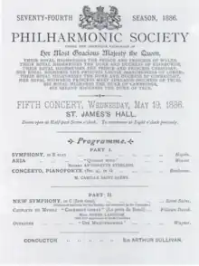The premiere, conducted by Saint-Saëns himself, took place at the Philharmonic Society's concert of 19 May 1886, at St James's Hall, London. In the opening half of the concert, Saint-Saëns was the soloist in Beethoven's Fourth Piano Concerto, with Arthur Sullivan conducting. In the second half, in keeping with the Society's tradition of inviting composers to perform their own works, Saint-Saëns himself conducted the performance of his new symphony. For his efforts, Saint-Saëns received an honorarium of £30.[n 4]