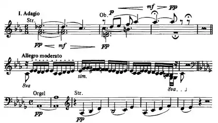 After its slow introduction, the first movement leads to a theme of Mendelssohnian (or Schubertian) character, followed by a second subject of a gentler cast, with various secondary themes played in major, and soon after repeated in minor forms; chromatic patterns play an important role in both movements. This material is worked out in fairly classical sonata-allegro form, and gradually fades to a quieter mood, which becomes a slightly ominous series of plucked notes in cello and bass, ending on a G pitch, followed by a slow and soft sustained A note in the organ, resolving into the new key of D major for the poco adagio section of the movement. This evolves into a dialogue between organ and strings, recalling the earlier main theme of the movement before the recapitulation. The movement ends in a quiet morendo.