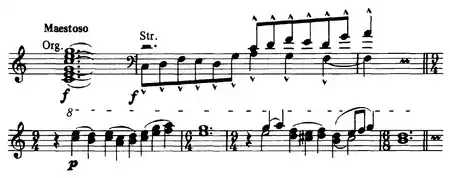 It has been commonly noted that the opening theme of the symphony recalls the Dies Irae by using the first five pitches of the well-known medieval chant. Given the dedication "to the memory of Franz Liszt," who died in 1886, it has been suggested that Saint-Saëns made intentional use of the motif to suggest the "resurrection and eternity" of Liszt.[27] As various scholars have pointed out, however, the original dedication was intended "as a homage" to Franz Liszt the man, and not the memory, since his death occurred between the London premiere of the work and its eventual publication.[28] In a letter dated June 19, 1886, Liszt wrote to Saint-Saëns, acknowledging both the intended dedication and "the success of the symphony in London."[29] In Fallon's view, the work is non-programmatic and the coincidence of pitches with the Dies Irae insignificant.[30] In Deruchie's analysis, Saint-Saëns may have intended the idea of resurrection linked to the Dies Irae with the renewal of the symphonic genre itself.[31] In a 1918 letter to Pierre Adjutant, Saint-Saëns wrote "if a symphony could claim the honor of renewing the symphonic genre, it would be my symphony in C minor, on account of its unusual division and its use of the organ."[32]