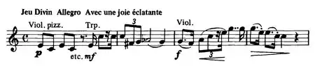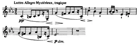 - The first movement begins with the main theme in the violins and is taken up in the basses and gradually works up to a climax. As it dies away a hymn-like theme appears in the muted strings. The second melody follows in the woodwinds with violins and bass accompaniment, this in turn followed by a theme reminiscent of the "Dresden Amen" in a long tremolo, the trumpets giving out their original theme, to full accompaniment. After recapitulation the main theme appears in the horns, the violins in agitated accompaniment. The close of the section is vehement, gradually dying away and leading to the second movement without halt.