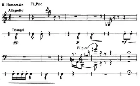 The Humoreske is for winds and percussion alone. In the notes Nielsen wrote for the symphony's premiere, he said that wind and percussion in the movement "quarrel, each sticking to his own tastes and inclinations";[3] Nielsen went on to liken this to the musical world of the time.
