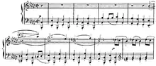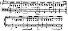 The Menuet is in ternary form, like the Marche funèbre. Luguenot writes that "the Minuet in B♭ minor is in fact a scherzo that anticipates shades of Bruckner—full of energy and brightened by a lyrical trio."[1] Adrian Corleonis suggests that "Berlioz and Haydn are in closest proximity in the hectic Minuet, combining the spirit of the Ronde du Sabbat and Marche au Supplice from the former's Symphonie Fantastique, with a palpable debt to the Minuet from the latter's "Les Quintes" Quartet, Op. 76 No. 2, which Alkan transcribed."[4]