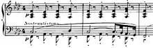 Although it is generally performed as a self-contained work, it comprises études Nos. 4–7 from the Douze études dans tous les tons mineurs (Twelve Studies in All the Minor Keys), Op. 39, each title containing the word Symphonie (French: Symphony). The four movements are titled Allegro moderato, Marche funèbre, Menuet, and Finale. Much like the Concerto for Solo Piano (Nos. 8–10), the Symphony is written so as to evoke the broad palette of timbres and harmonic textures available to an orchestra. It is an early example of a piano symphony. In the opinion of François Luguenot, it "does not contain the excesses of [Alkan's] Concerto or the Grande Sonate (Op. 33). But, rather like [Alkan's] Sonatine Op. 61, it proves that Alkan was also capable of writing perfectly balanced and almost ‘Classical’ works."[1] Unlike a standard classical symphony, each movement is in a different key, rising in progressive tonality by a perfect fourth.[2]