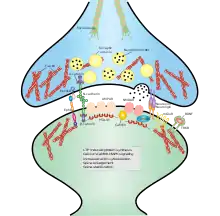Beyond their extracellular contact with each other, neurexins and neuroligins also bind intracellularly to a vast network of adaptor proteins and scaffolding structures, which in concert with the actin cytoskeleton, help localize necessary components of synaptic transmission. For example, the first neuroligin (NLGN1) discovered was identified by its PDZ domain which binds to PSD95, a well-known a scaffold protein at glutamatergic synapses that functionally links NMDA receptors to the proper post-synaptic locale.[21][24] Similarly, another isoform of neuroligin (NLGN2) interacts with gephyrin, a scaffolding protein specific to GABA-ergic synapses, and is responsible for activation of the synaptic adapator protein collybistin.[25] In the case of neurexins, their intracellular binding interactions are equally as important in recruiting the essential machinery for synaptic transmission at the active zone. Like neuroligins, neurexins possess a PDZ-domain that associates with CASK (Calcium-calmodulin-dependent protein kinase).[24] In addition to phosphorylating itself and neurexin, CASK promotes interactions between neurexins and actin binding proteins, thus providing a direct link by which neurexin can modulate cytoskeletal dynamics that is essential for synaptic stability and plasticity. Neurexin can also bind synaptotagmin, a protein embedded in the membrane of synaptic vesicles, and can also promote associations with voltage-gated calcium channel which mediate the ion flux required for neurotransmitter exocytosis upon synaptic stimulation.[26][23] In this way, neurexin and neuroligin coordinate the morphological and functional aspects of the synapse which in turn permits nascent, immature contacts to stabilize into full-fledged functional platforms for neurotransmission.