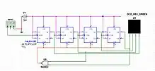 A Johnson counter (or switch-tail ring counter, twisted ring counter, walking ring counter, or Möbius counter) is a modified ring counter, where the output from the last stage is inverted and fed back as input to the first stage.[2][3][4] The register cycles through a sequence of bit-patterns, whose length is equal to twice the length of the shift register, continuing indefinitely. These counters find specialist applications similar to the decade counter, digital-to-analog conversion, etc. They can be implemented easily using D- or JK-type flip-flops.