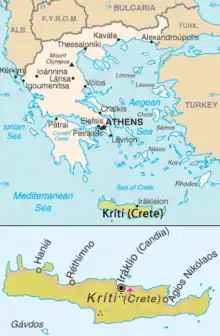 One of the first examples of synoecism in historical Greece can be found in Crete. Prior to the second millennium, Greek settlement on both the mainland and on the island of Crete consisted of scattered villages with no central administration. The development and construction of large palaces on Crete however is the earliest example of building for the purpose of centralized authority and administration. Synoecism in Crete had combined administrative, commercial, and religious connotations as the concentration of stately duties in one place allowed for efficient operation. This development of large palatial structures coincided with an explosion of Minoan art and overseas trade and was probably the driving factor in constructing these buildings.[2] This period of expanded trade and overseas networks is also defined by the term palace economy which was popularized by Sir Arthur Evans when he excavated and described the economic activity of the palace of Knossos. The massive scale of the redistributive economy of Crete as well as its overseas trade networks is indicative of a synoecism from a culture of primarily subsistence agriculture to that of a highly organized and hierarchically structured civilization.