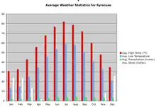 Syracuse on average receives an annual precipitation of 38.47 inches (977 millimeters), with the months of July through September being the wettest in terms of total precipitation,[28] while precipitation occurs on more days each month during the snow season.[30]