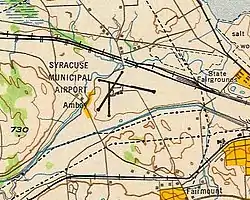 After the war, the city took over operations of Hancock Field, converting it to a commercial airfield in 1948.[2] The smaller Municipal Airport couldn't compete with the larger and more centrally located Syracuse Hancock International Airport and closed in 1949. After its closure, most of the land the airport was located on was acquired by Allied Chemical and Dye Corporation and transformed into chemical waste beds by 1951.[3]