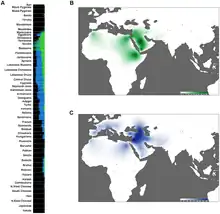 Genetic tests on Syrians were included in many genetic studies.[100][101][102] The genetic marker which identifies descendants of the ancient Levantines is found in Syrians in high proportion.[103] Modern Syrians exhibit "high affinity to the Levant" based on studies comparing modern and ancient DNA samples.[104] Syrians cluster closely with ancient Levantine populations of the Neolithic and Bronze Ages.[105] A Levantine ancestral genetic component was identified; it is estimated that the Levantine, the Peninsular Arabian and East African ancestral components diverged 23,700-15,500 years ago, while the divergence between the Levantine and European components happened 15,900-9,100 years ago.[106] The Levantine ancestral component is the most recurrent in Levantines (42–68%); the Peninsular Arabian and East African ancestral components represent around 25% of Syrian genetic make-up.[107][108]