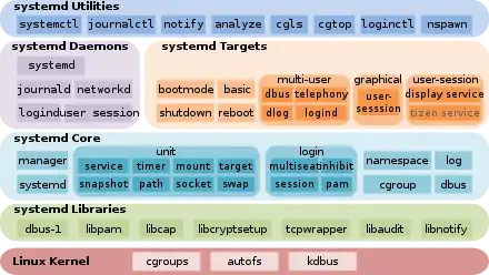 The architecture of systemd as it is used by Tizen. Several systemd targets, including telephony, bootmode, dlog, and tizen service are from Tizen and are not components of systemd.[36]