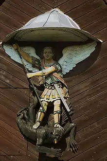 Wood sculpture of Archangel Michael, atop the church in Szalowa (18th century).