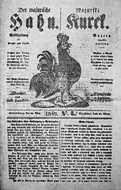 It became an important center of the Polish movement in Masuria and resistance to Germanisation. In 1849-1851 a bilingual folk magazine Der masurische Hahn/Kurek Mazurski was issued in the town.[8] The Masurian People's Party (Mazurska Partia Ludowa), founded in 1896 in Lyck (Ełk), had one of its main branches here. From 1906 the Polish newspaper Mazur was published here, and in 1910, Bogumił Labusz and Gustaw Leyding founded the Masurian People's Bank (Mazurski Bank Ludowy).[3] In 1908 Polish writer and Nobel Prize laureate Henryk Sienkiewicz, who popularized the small town through his historical novel The Knights of the Cross and whose works were published in Mazur, visited the town.[5][9] In post-war Poland, a monument to Sienkiewicz was unveiled in the town center, next to the town hall and the ruins of the castle.[5][9]