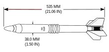 Another reason to use a smoothbore barrel for armor piercing shot, is that smoothbore guns allow for higher pressures, and thus higher projectile speeds.[4] The result is that the T-12 fired a conspicuously long APFSDS projectile. This BM2 shot (see picture) had a diameter of 38 mm and used 8.75kg of propellant instead of less than 6kg for the existing Soviet tank gun. It was fired at a muzzle velocity of 1,540 m/s as opposed to only 900 m/s for the usual armor piercing shot. At 1,000 m this improved armor penetration from 185 mm to 230 mm, enough to penetrate most NATO tanks of the period.[7]