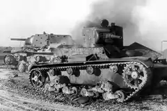 At the Battle of Tolvajärvi and afterwards, the Finnish managed to capture or destroy nearly 12 T-26 tanks during the defeat of the 75th Rifle Division.[38][39] At the battles of Suomussalmi and Raate, the Soviet 44th Rifle Division was encircled and lost all armour of its 312th OTB, including 14 T-26s.[36][40] Altogether, the Finns would capture almost 70 T-26 tanks of different models, including KhT-26 and KhT-130 flame-throwing tanks, during the Winter War, a number equal to the entire pre-war Finnish armoured force.[41]