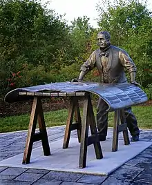 ![]() Work at the Trestle, a sculpture by Ruth Abernethy, depicts entrepreneur and engineer T.T. Vernon Smith. The sculpture was donated to the town of Wolfville, Nova Scotia by Allen Eaves, Vernon Smith's great grandson. | |