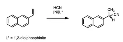 The RajanBabu group developed methodology in the area of hydrocyanation, leveraging the reaction of vinylarenes with HCN in the presence of Ni(0) complexes. Based on the phosphorus ligands within the Ni complex, the reaction can be rendered asymmetric.[12][13] The enantioselectivity could be further improved by tuning the electronics of the phosphine ligands to electronically differentiate the phosphorus chelates. Electronic tuning was accomplished, for example, using widely available sugars such as D-glucose and D-fructose.