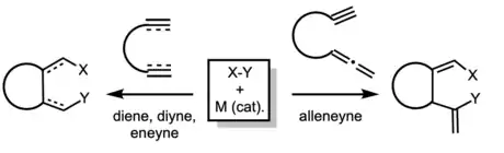 One area of interest to the RajanBabu group is catalytic multicomponent addition/cyclization reactions. This methodology allows for formation of carbocyclic and heterocyclic compounds from acyclic precursors including unactivated olefins and acetylenes.[14] This method leverages the reactivity of bifunctional reagents (X-Y) where X-Y in above scheme can represent R3Si−SiR‘3, R3Si−SnR‘3, R3Si−BR‘2, R3Sn−BR‘2, and trialkylsilicon- and trialkyltin- hydrides. The reactions are palladium-catalyzed, and incorporation of the X and Y species allows for vast diversification of the end products.[15][16][17] Application of this methodology afforded syntheses of highly alkylated indolizidines such as IND-223A.[18]