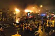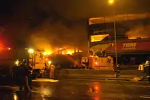 Flight 3054 was cleared to land at Congonhas's Runway 35L. Reviews by government officials of the surveillance videos showed that despite the aircraft touching down without incident, it did not slow down normally, veering to the left as it departed the far end at around 90 knots (170 km/h; 100 mph).[24] The runway is elevated above the surrounding area, and the aircraft's momentum carried it over traffic on the adjacent Avenida Washington Luís, a major thoroughfare, and crushed a four-story TAM Express facility, resulting in a large fire. The TAM Express facility contained offices and a warehouse, and was located adjacent to a Shell gas station. All 187 passengers and crew aboard died and the aircraft was destroyed.[25]