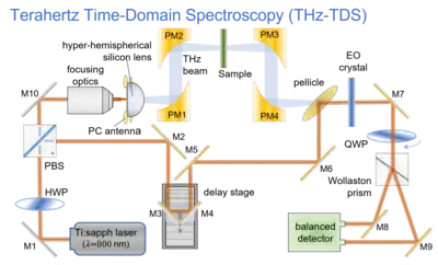 Components of a typical THz-TDS instrument, as illustrated in the figure, include an infrared laser, optical beamsplitters, beam steering mirrors, delay stages, a terahertz generator, terahertz beam focusing and collimating optics like parabolic mirrors, and detector.