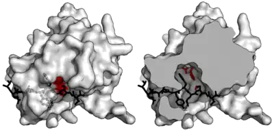 Specificity is endowed by the large contact area between enzyme and substrate. Proteases such as trypsin have specificity for one residue before and after the cleaved bond due to a shallow binding cleft with only one or two pockets that bind the substrate side chains. Conversely, viral proteases such as TEV protease have a long C-terminal tail which completely covers the substrate to create a binding tunnel. This tunnel contains a set of tight binding pockets such that each side chain of the substrate peptide (P6 to P1’) is bound in a complementary site (S6 to S1’).[4]