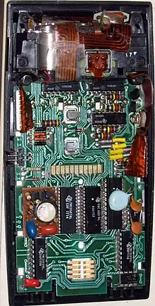 ![]() A TI-59 showing a magnetic storage card being inserted into the card reader in the side. | |