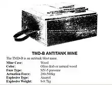 The TMD-B was developed before the start of the Second World War and is simply a wooden box filled with explosives, there are three raised boards on the top of the box, the central one being hinged. The central hinged board is locked into place by a strip of wood inserted into a groove that runs along the edge of all three boards. When enough pressure is applied to the top of the mine the boards collapse onto the plunger of the MV-5 detonator, triggering the mine. A fabric carrying handle is typically fixed to one side of the mine. It was normally painted olive green, gray or white.
