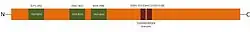 The primary function of the TMEM131 protein is not well understood. The human form has 1883 amino acid residues, with an isoelectric point of 8.74 and a molecular mass of 205,100 Daltons.[16] It has been shown to contain two transmembrane domains at residues 1,091-1,111 and 1,118-1,138. Three DUF3651 regions are located on the N-terminal side of the two adjacent transmembrane domains. These are located at residues 173-245, 502-582, and 639-708. The intercellular location of the protein has not been experimentally determined, but it is thought to reside in either the plasma membrane or endoplasmic reticulum, with each domain on both the N-terminal and C-terminal sides of the transmembrane regions being cytosolic.[17] It contains numerous phosphorylation sites which have been shown both experimentally and with bioinformatic tools.[5][16] Bioinformatic analysis of the protein using the NetPhos tool[18] predicted 145 potential phosphorylation sites throughout the entire length of the protein.[19]